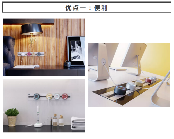 轨道的设计使电源插座在限定的空间上变得灵活,解决了电源线太短的烦恼,也解决了多台电器同时工作时插座不够用的烦人情况。